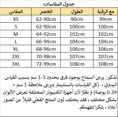 مقاس موحد (بالسنتم)عرض الكتفين: 37- 45تمثال نصفي: 90-130طول الكم: 55الطول: 100 على الأطولالخصر: 64-100طول البنطال: 90..